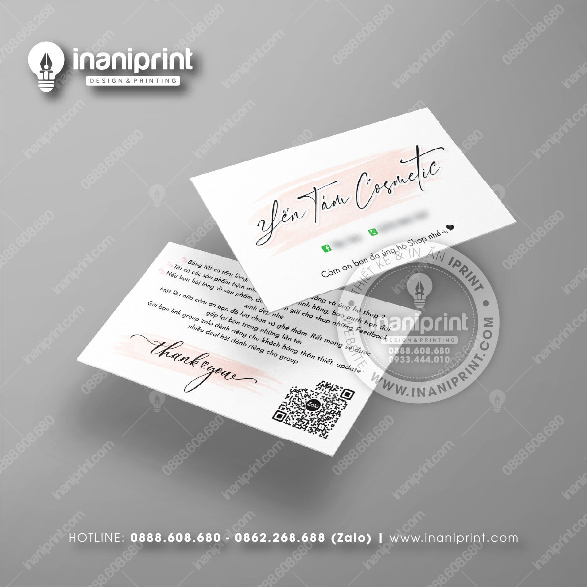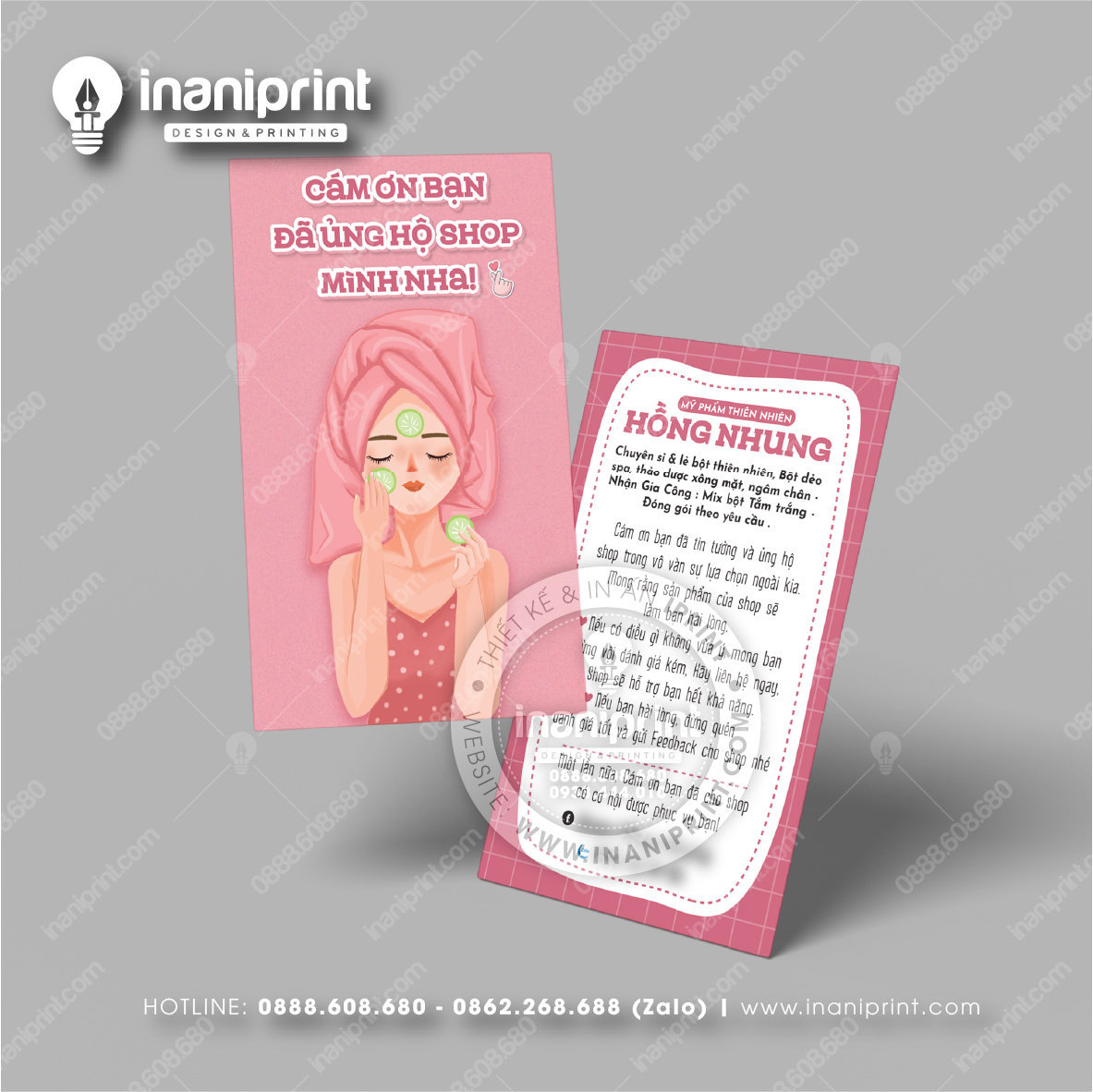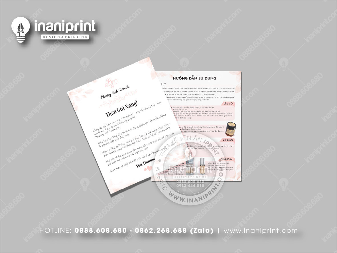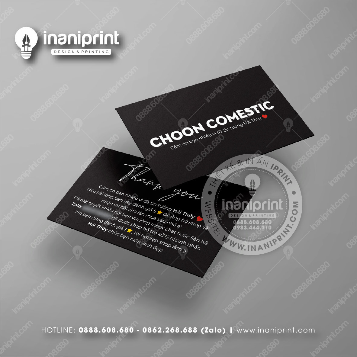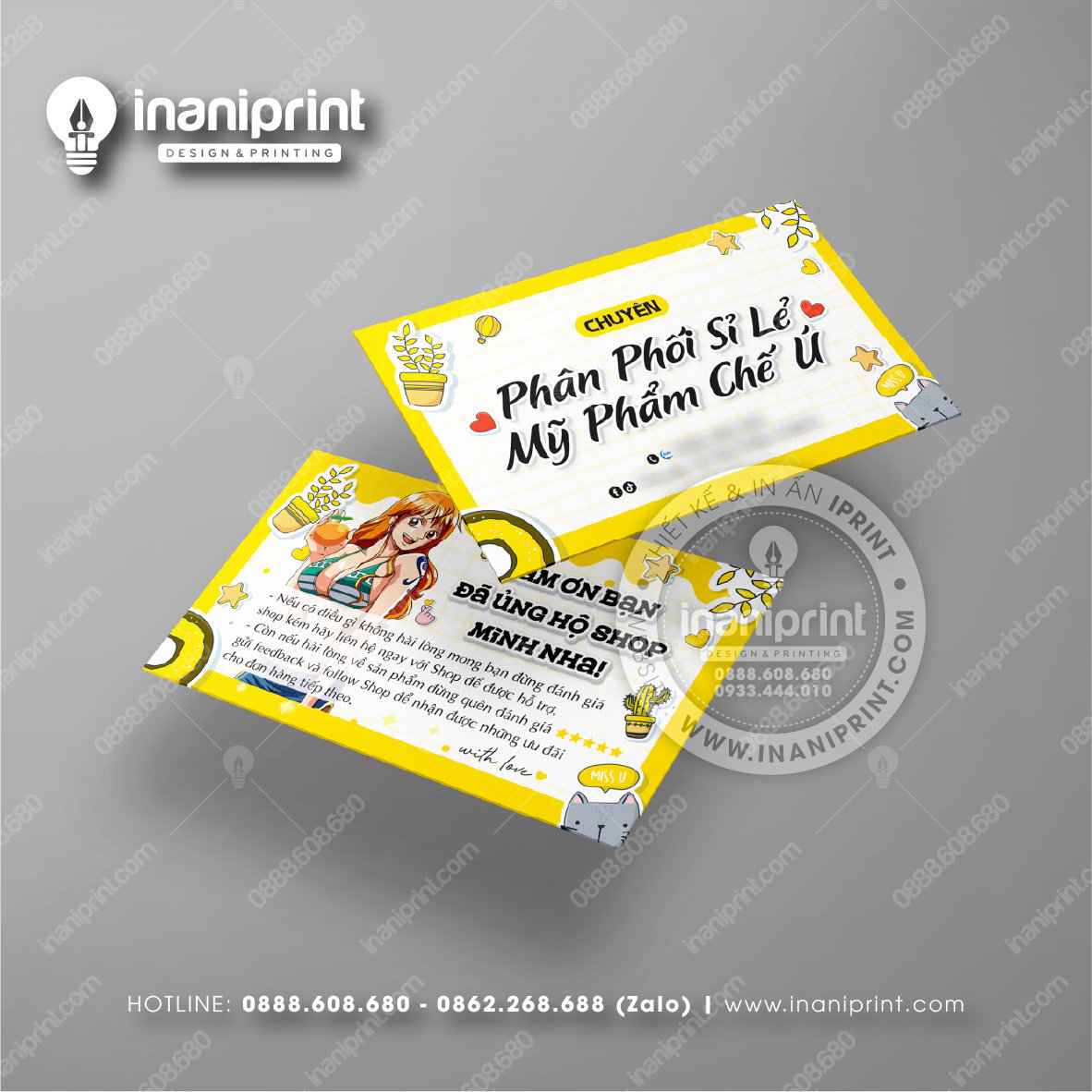 In Name Card Shop Mỹ Phẩm là quá trình thiết kế và in ra những tấm Danh Thiếp (Card Visit) có chứa thông tin quan trọng: tên, chức vụ, công ty, số điện thoại, email, website, logo. Chúng được in trên giấy (Couche, Bristol, mỹ thuật), nhựa hoặc PVC, bên cạnh đó là được áp dụng in offset hay kỹ thuật số, cùng các gia công tăng tính thẩm mỹ và độ bền (cán màng, ép kim).