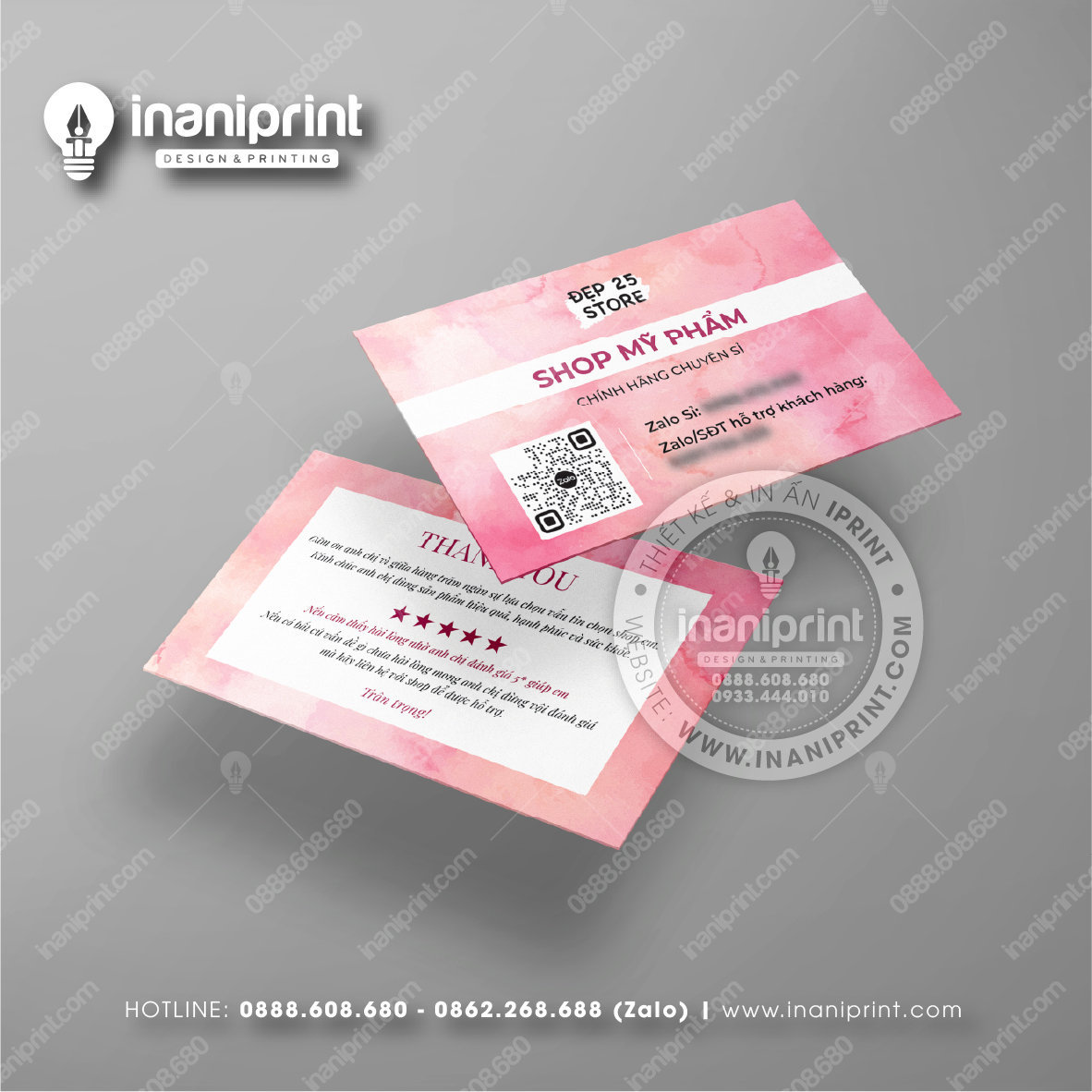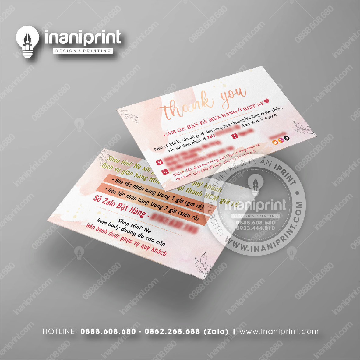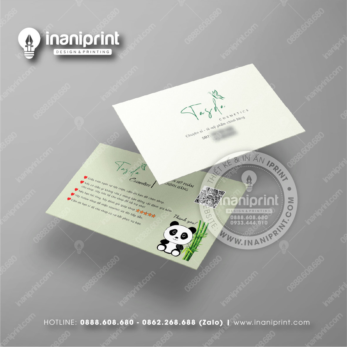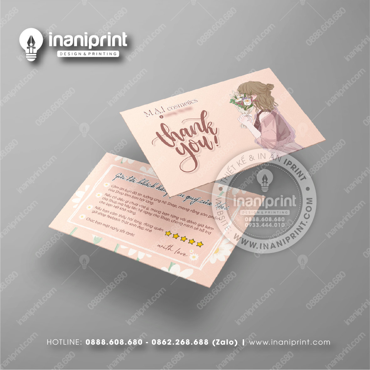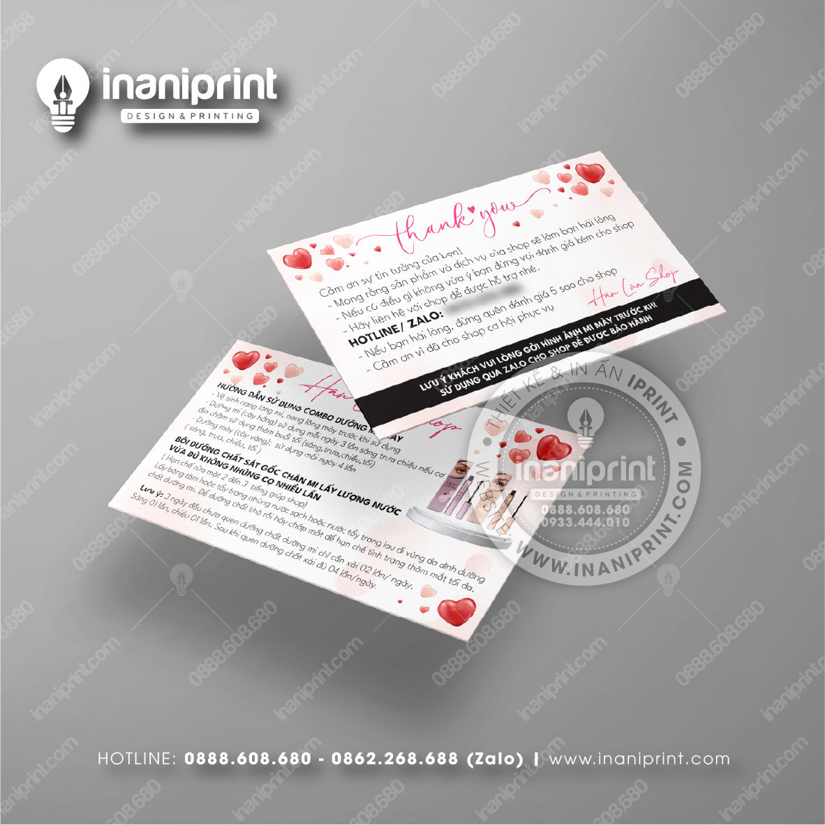 In Name Card Shop Mỹ Phẩm là quá trình thiết kế và in ra những tấm Danh Thiếp (Card Visit) có chứa thông tin quan trọng: tên, chức vụ, công ty, số điện thoại, email, website, logo. Chúng được in trên giấy (Couche, Bristol, mỹ thuật), nhựa hoặc PVC, bên cạnh đó là được áp dụng in offset hay kỹ thuật số, cùng các gia công tăng tính thẩm mỹ và độ bền (cán màng, ép kim).