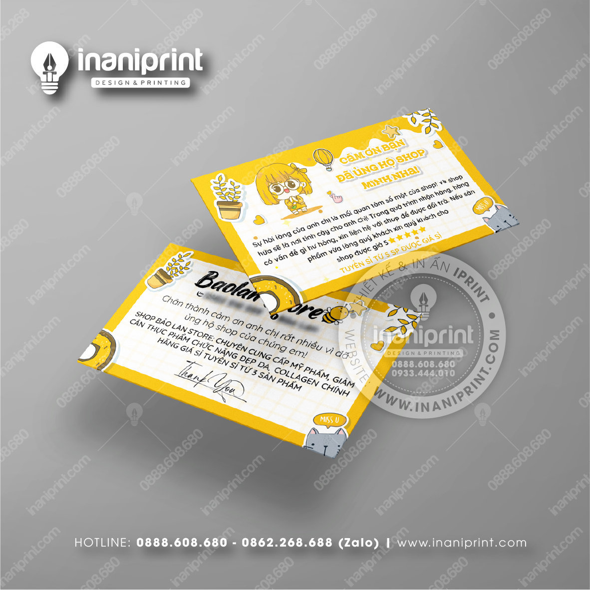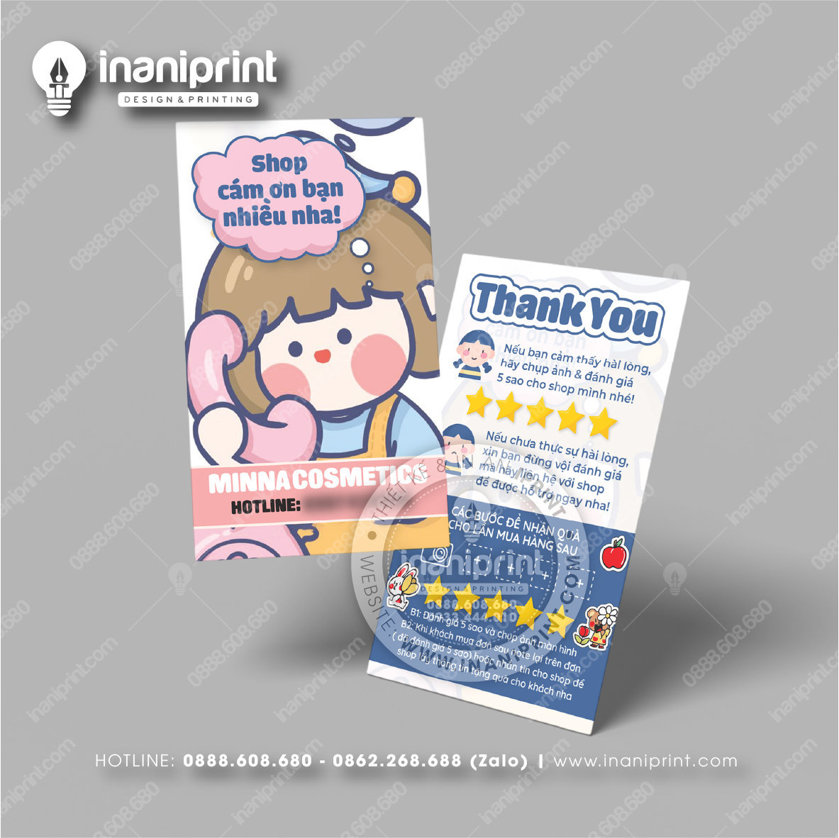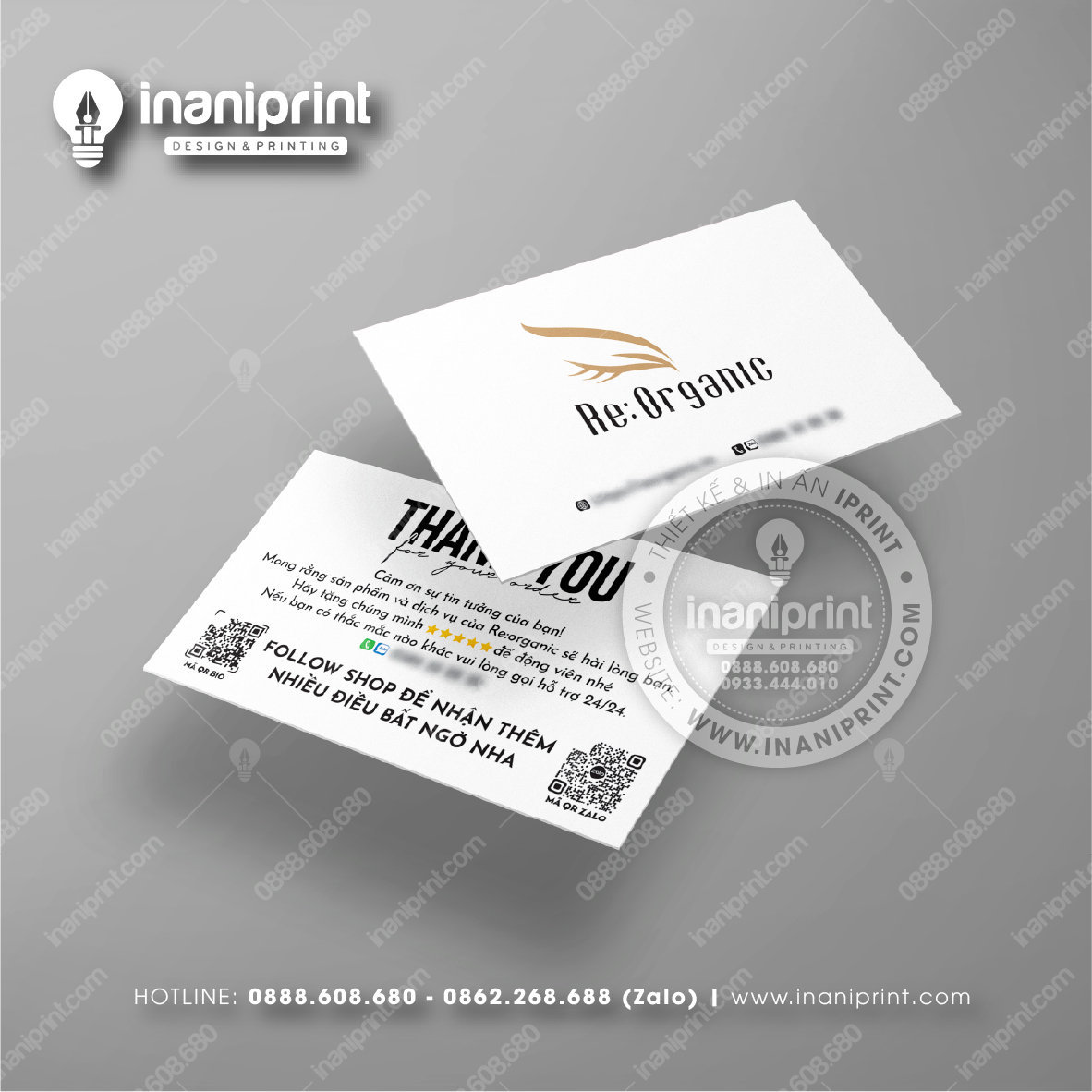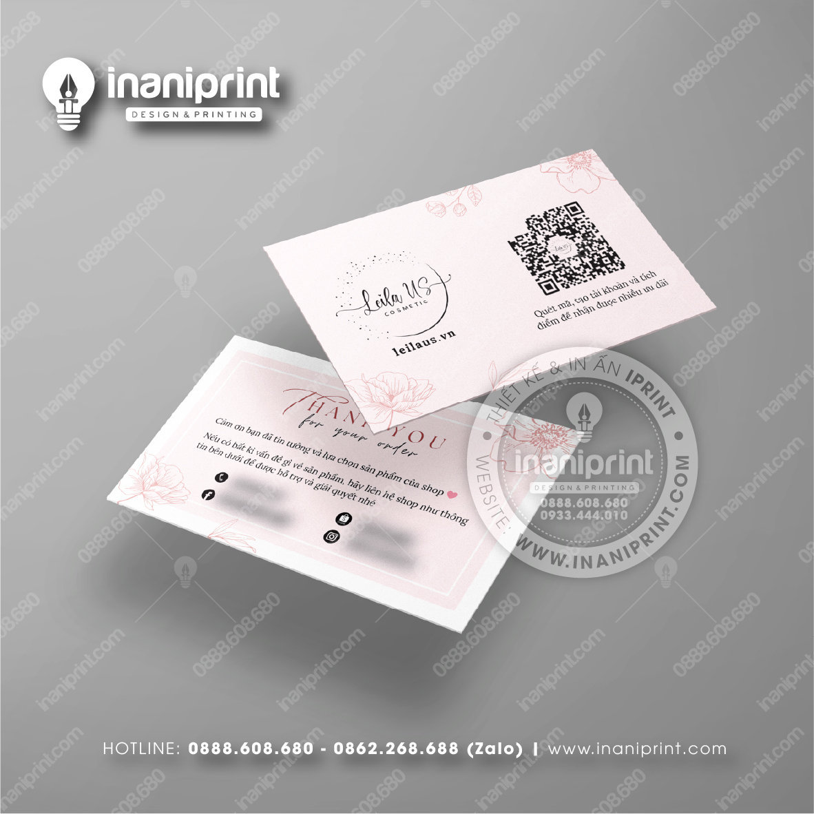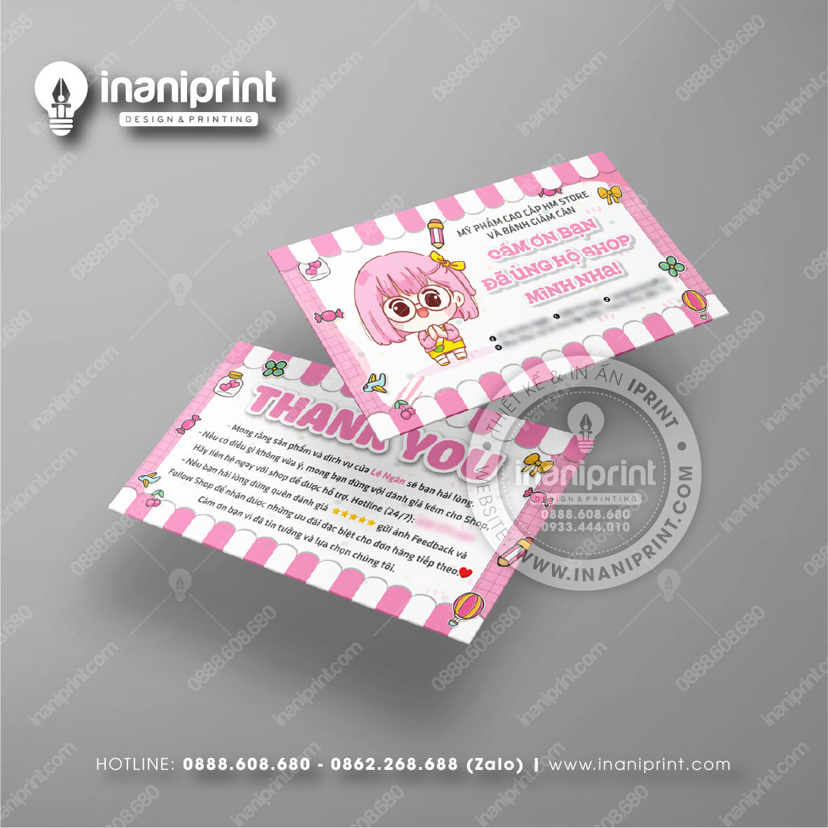 In Name Card Shop Mỹ Phẩm là quá trình thiết kế và in ra những tấm Danh Thiếp (Card Visit) có chứa thông tin quan trọng: tên, chức vụ, công ty, số điện thoại, email, website, logo. Chúng được in trên giấy (Couche, Bristol, mỹ thuật), nhựa hoặc PVC, bên cạnh đó là được áp dụng in offset hay kỹ thuật số, cùng các gia công tăng tính thẩm mỹ và độ bền (cán màng, ép kim).