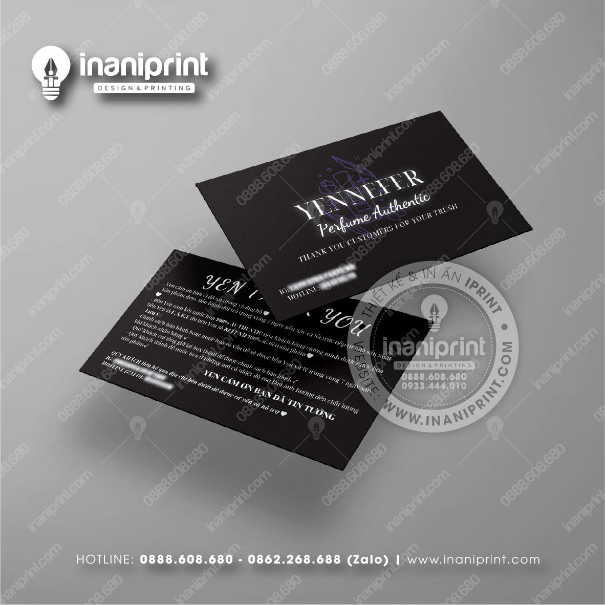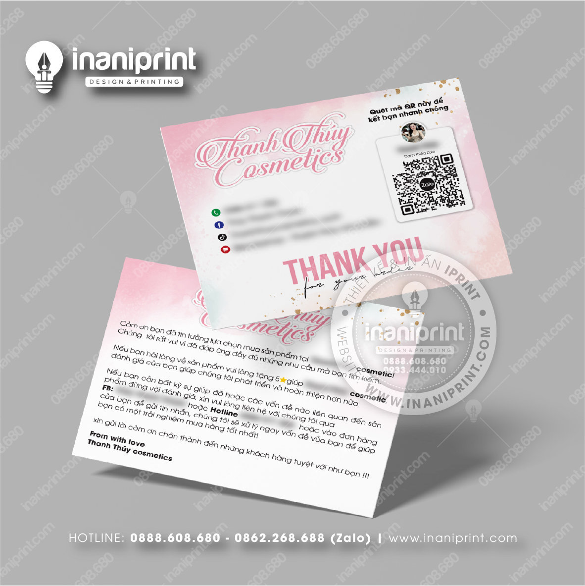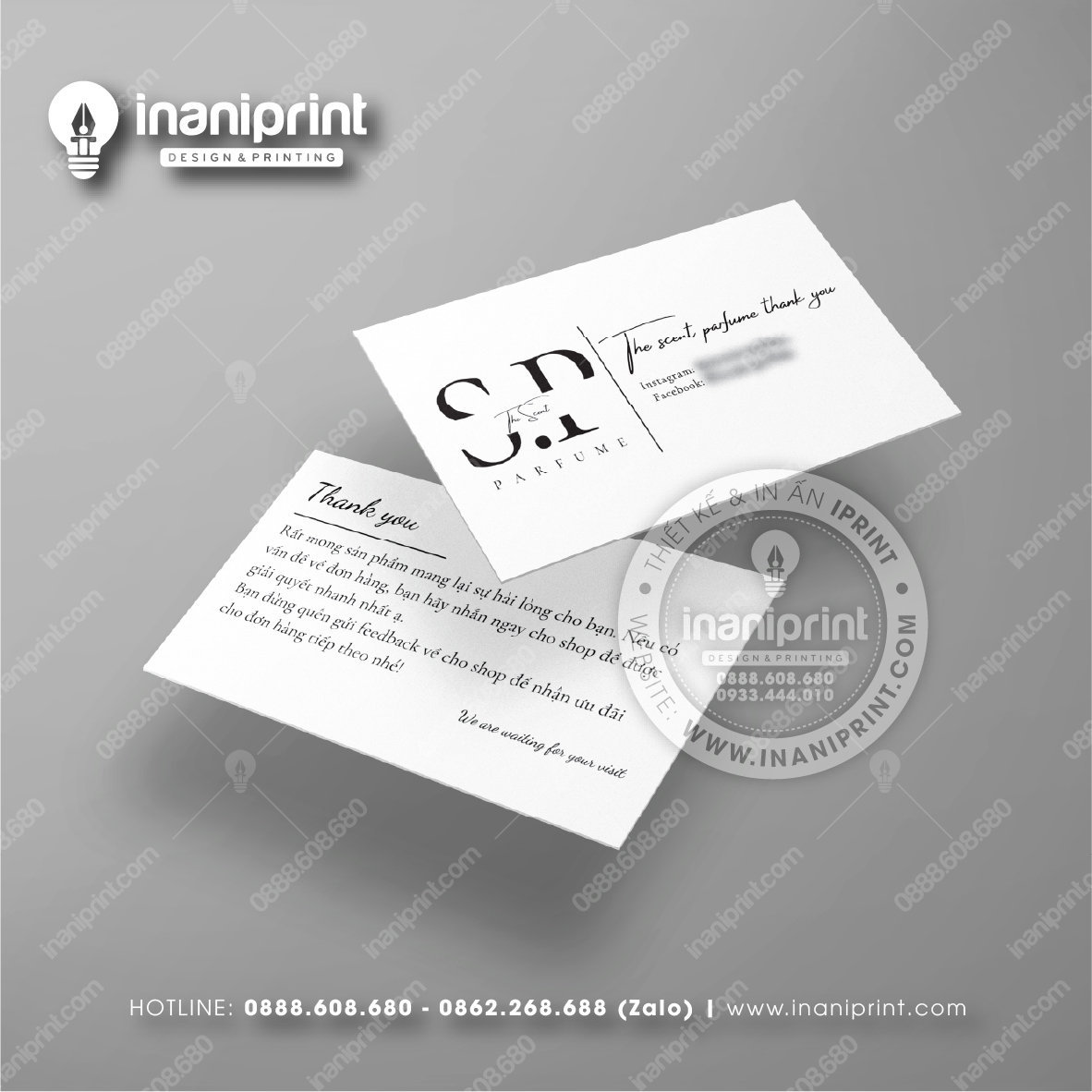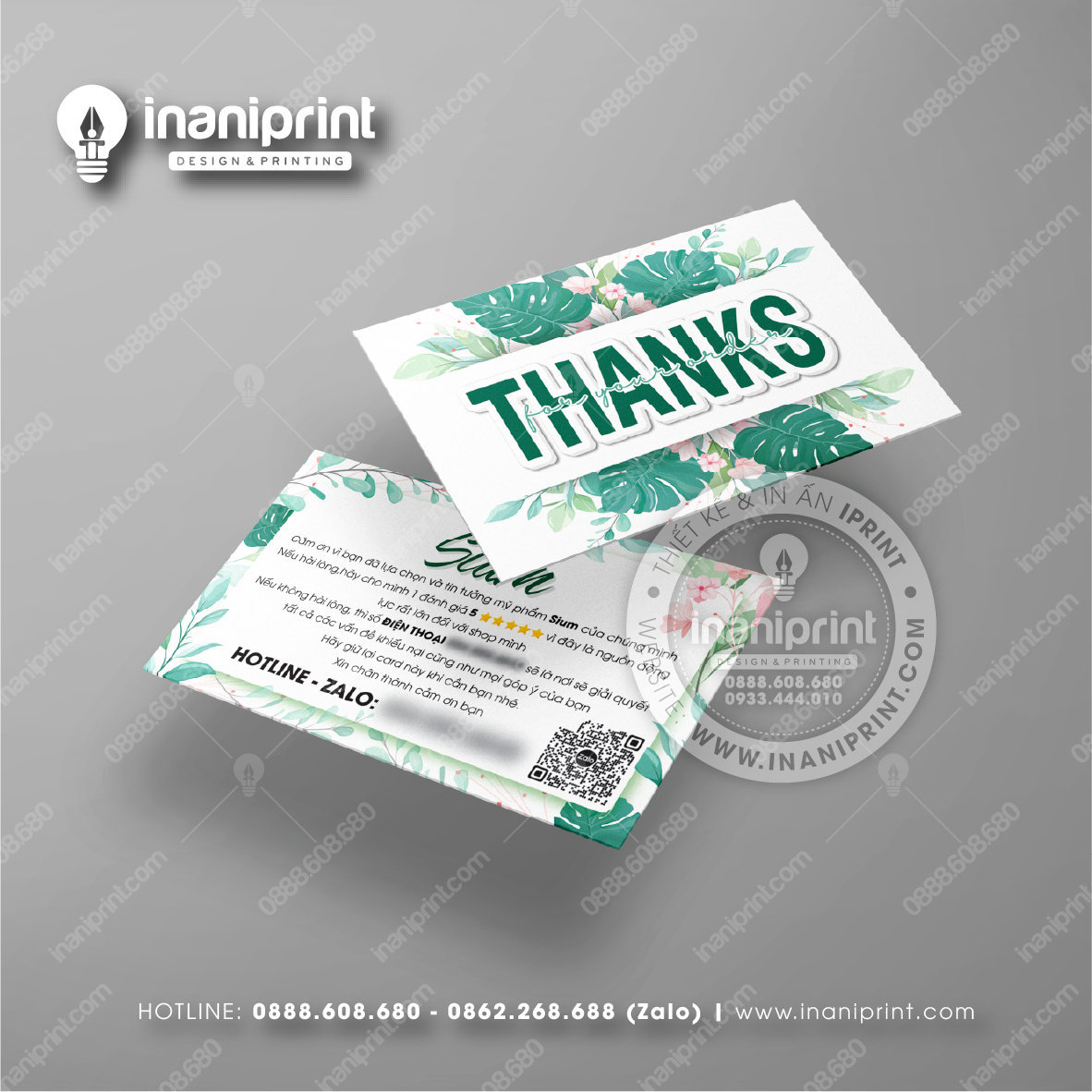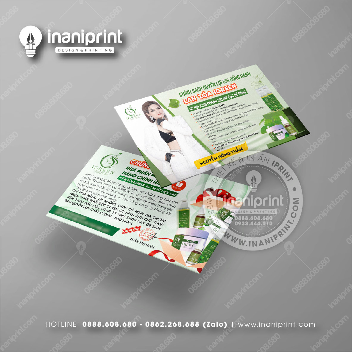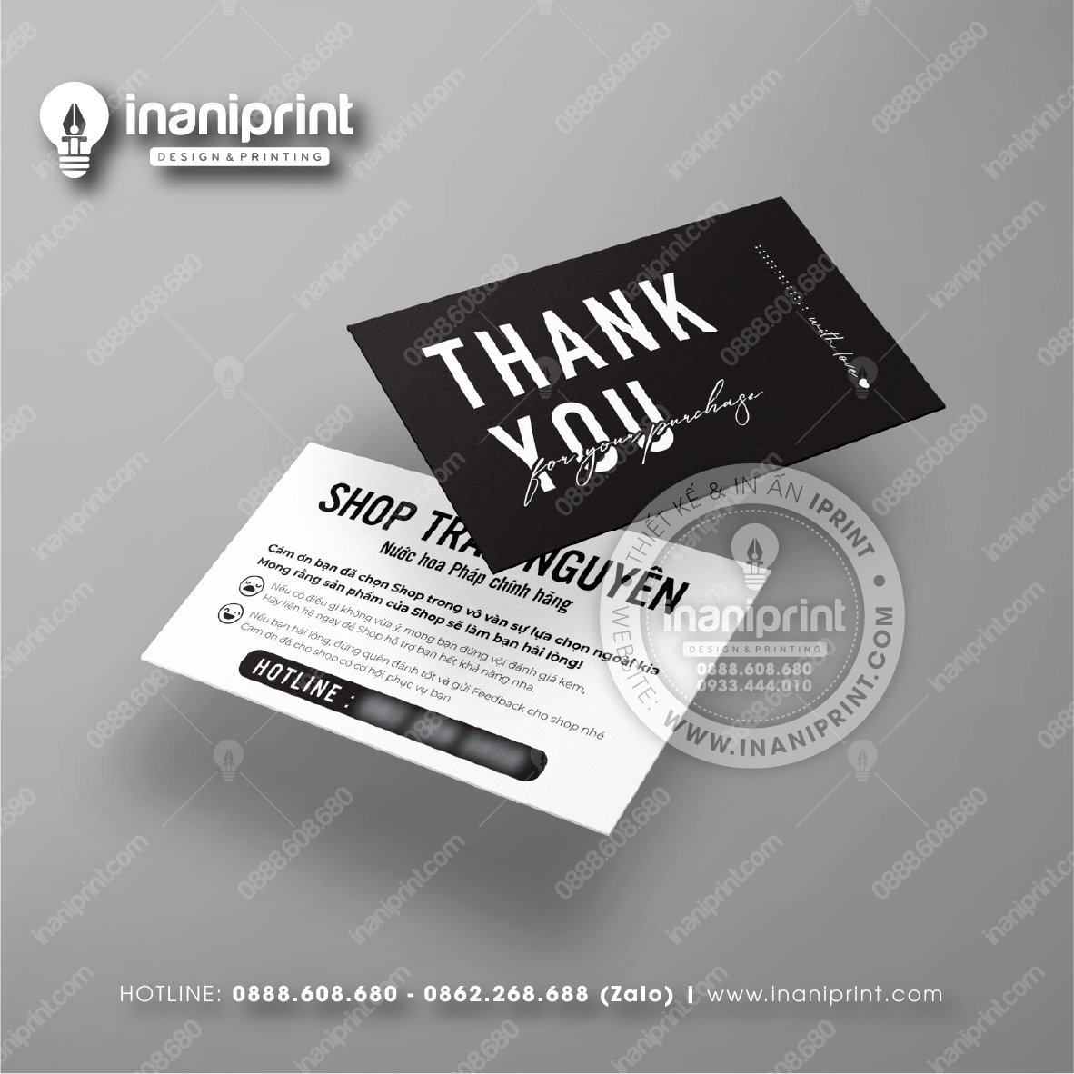 In Name Card Shop Mỹ Phẩm là quá trình thiết kế và in ra những tấm Danh Thiếp (Card Visit) có chứa thông tin quan trọng: tên, chức vụ, công ty, số điện thoại, email, website, logo. Chúng được in trên giấy (Couche, Bristol, mỹ thuật), nhựa hoặc PVC, bên cạnh đó là được áp dụng in offset hay kỹ thuật số, cùng các gia công tăng tính thẩm mỹ và độ bền (cán màng, ép kim).