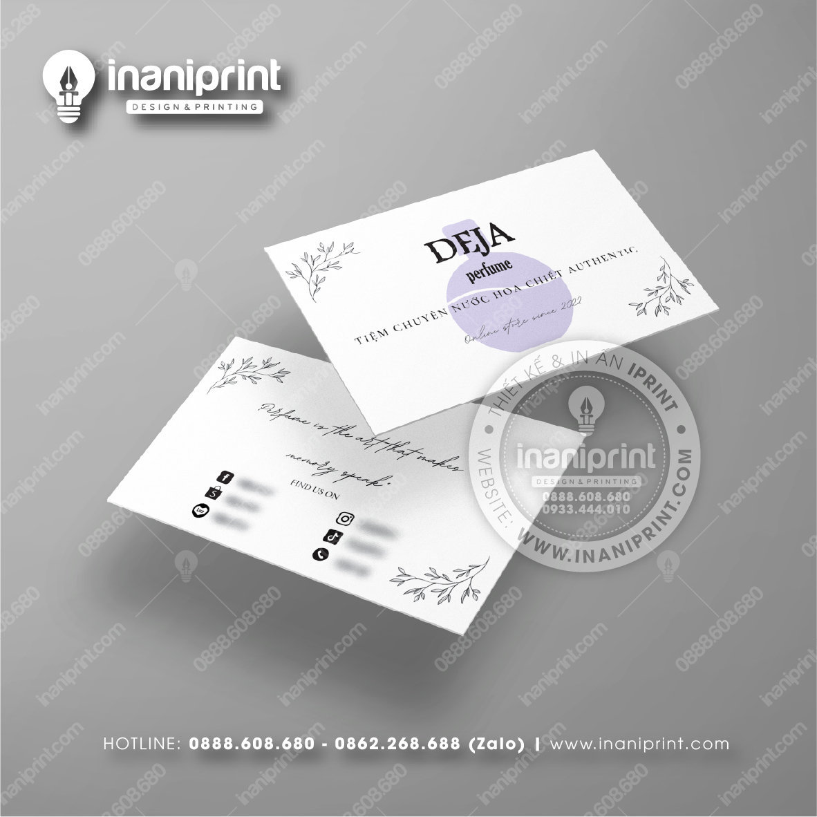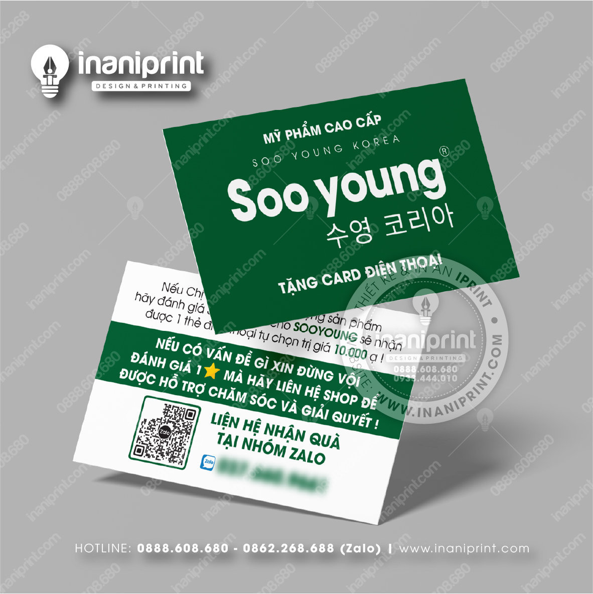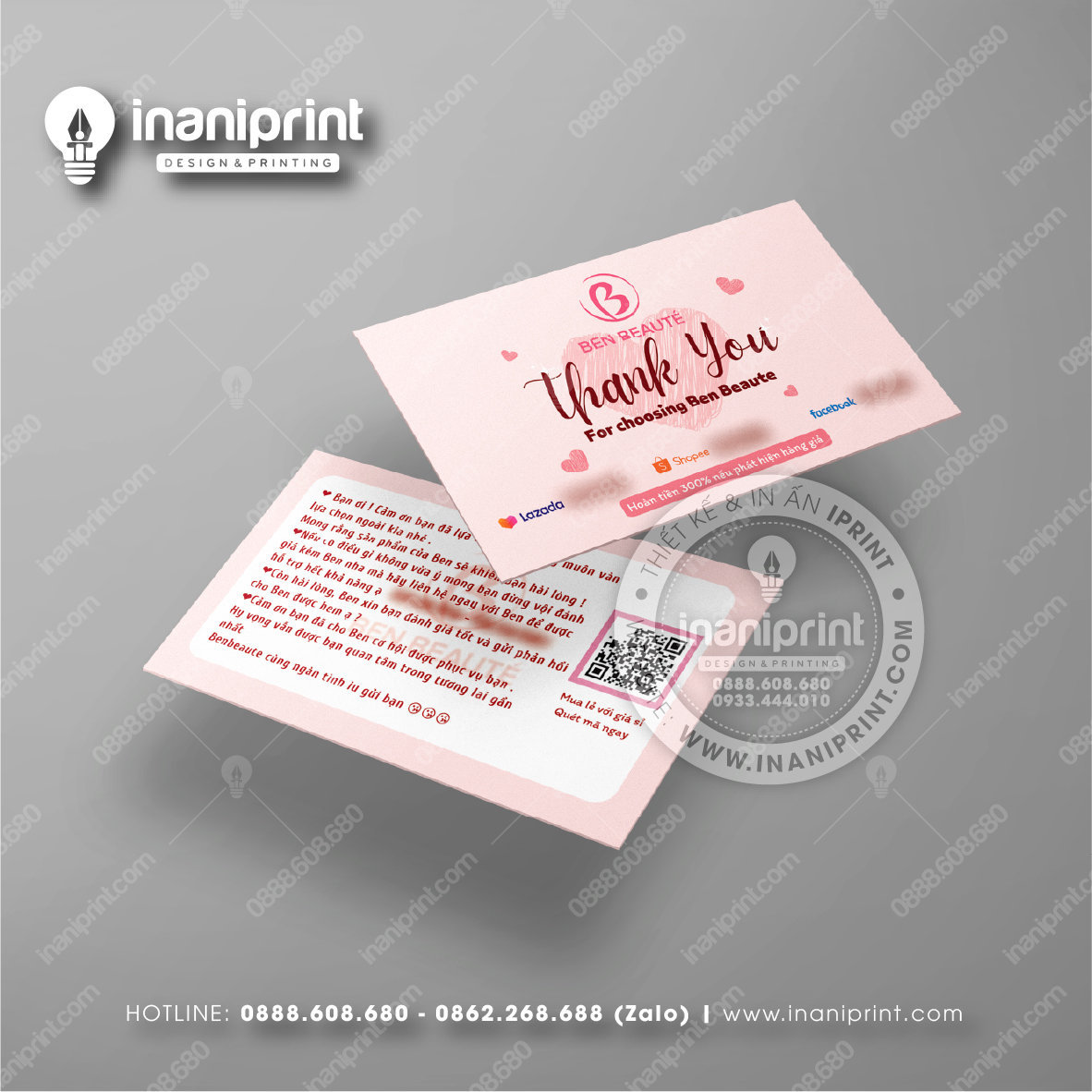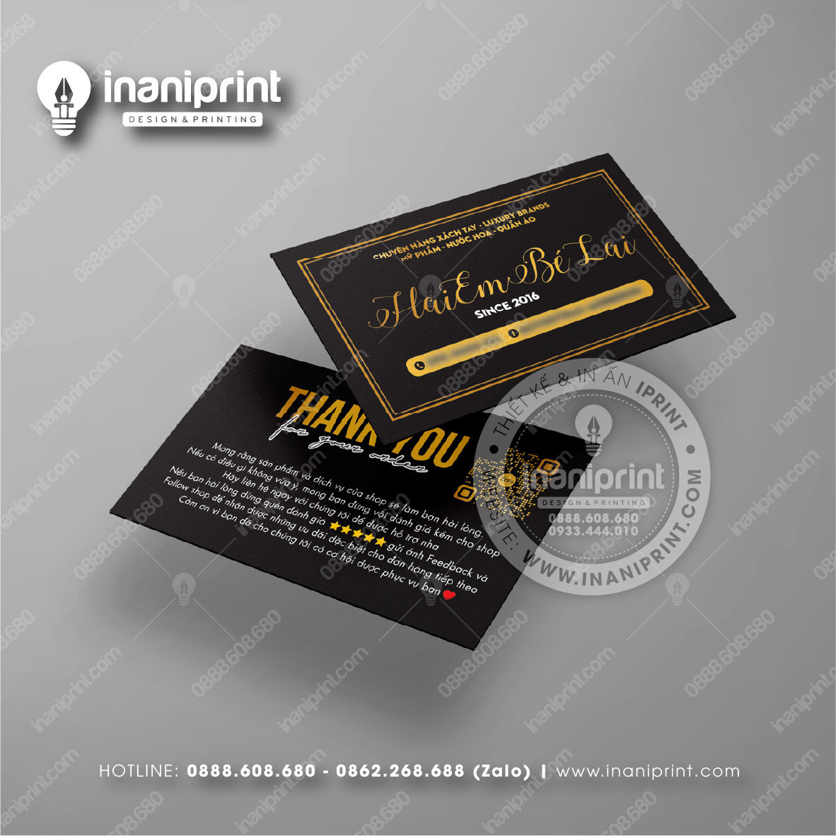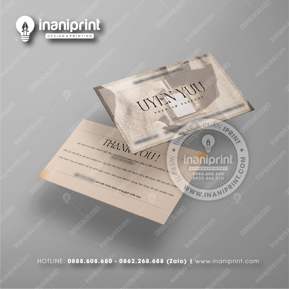 In Name Card Shop Mỹ Phẩm là quá trình thiết kế và in ra những tấm Danh Thiếp (Card Visit) có chứa thông tin quan trọng: tên, chức vụ, công ty, số điện thoại, email, website, logo. Chúng được in trên giấy (Couche, Bristol, mỹ thuật), nhựa hoặc PVC, bên cạnh đó là được áp dụng in offset hay kỹ thuật số, cùng các gia công tăng tính thẩm mỹ và độ bền (cán màng, ép kim).