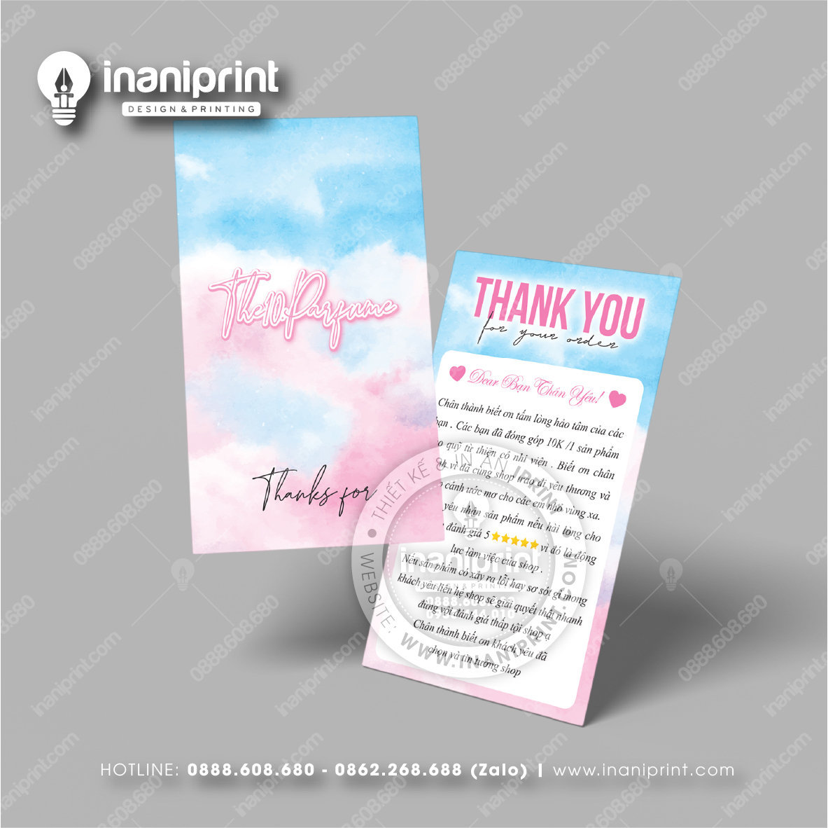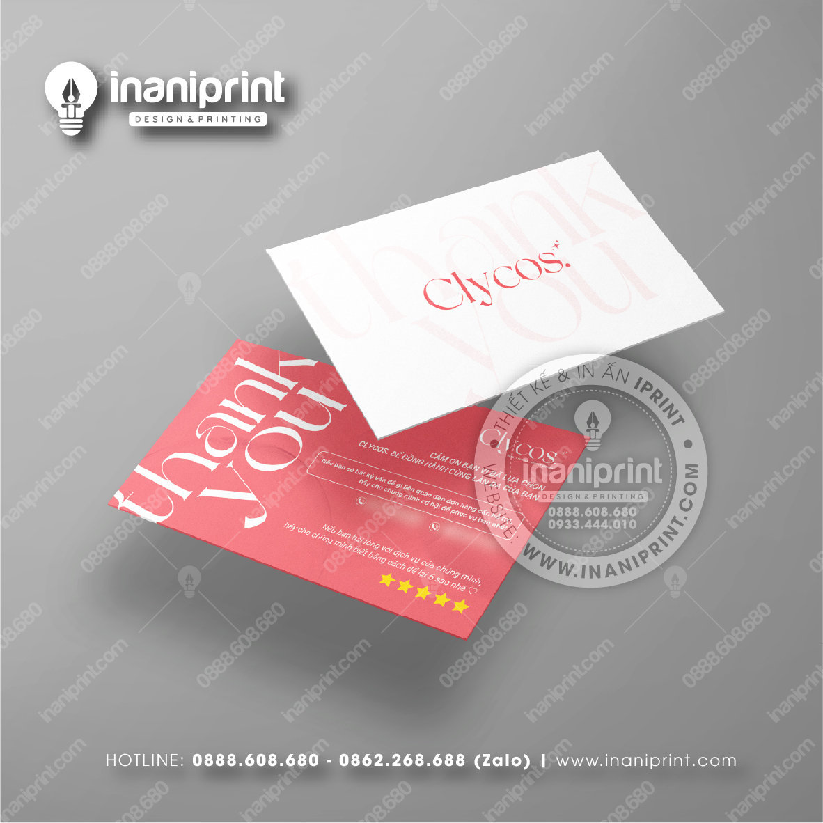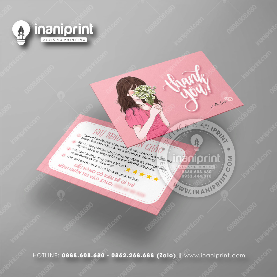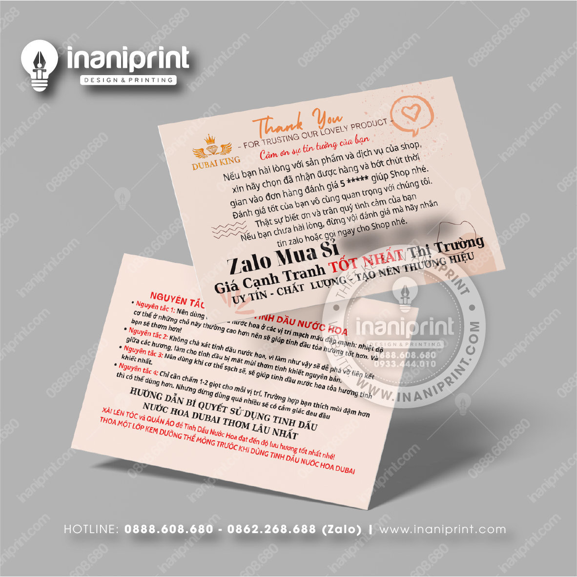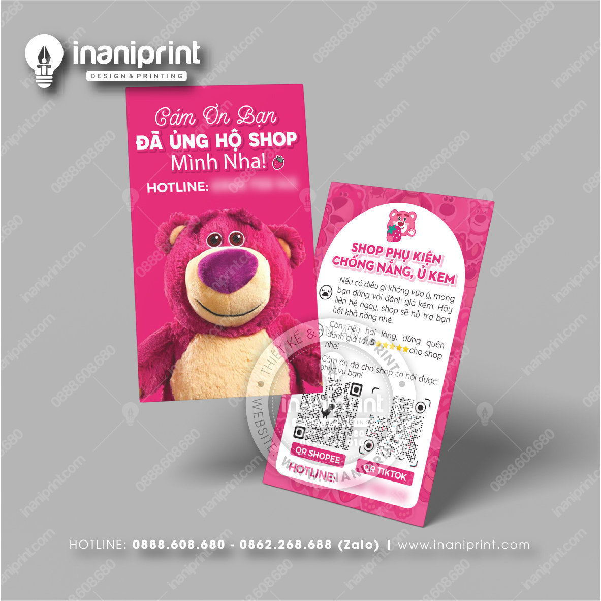 In Name Card Shop Mỹ Phẩm là quá trình thiết kế và in ra những tấm Danh Thiếp (Card Visit) có chứa thông tin quan trọng: tên, chức vụ, công ty, số điện thoại, email, website, logo. Chúng được in trên giấy (Couche, Bristol, mỹ thuật), nhựa hoặc PVC, bên cạnh đó là được áp dụng in offset hay kỹ thuật số, cùng các gia công tăng tính thẩm mỹ và độ bền (cán màng, ép kim).