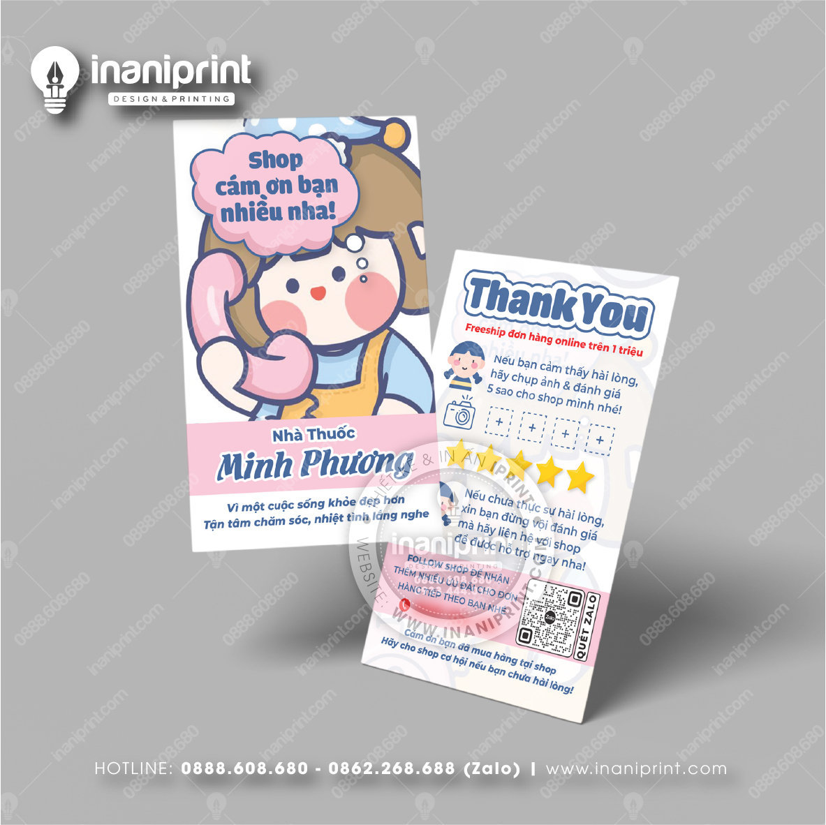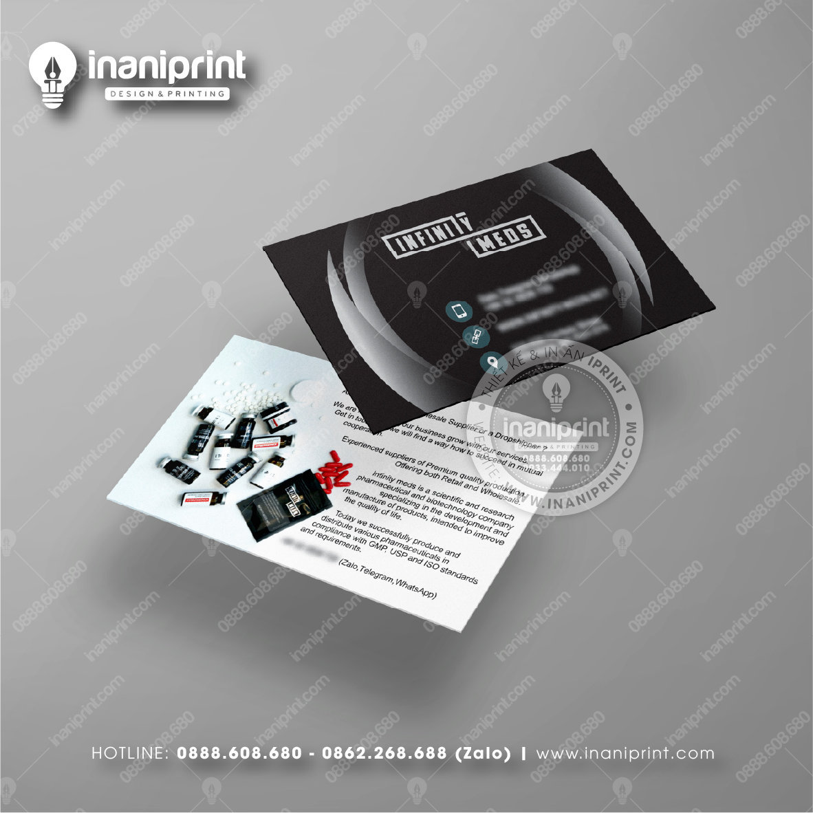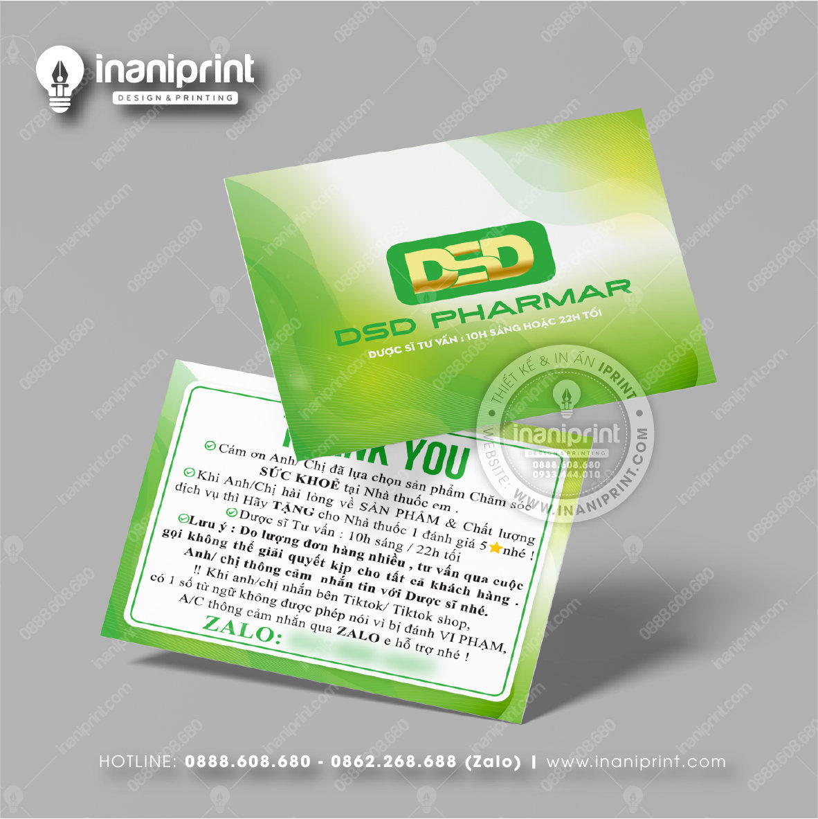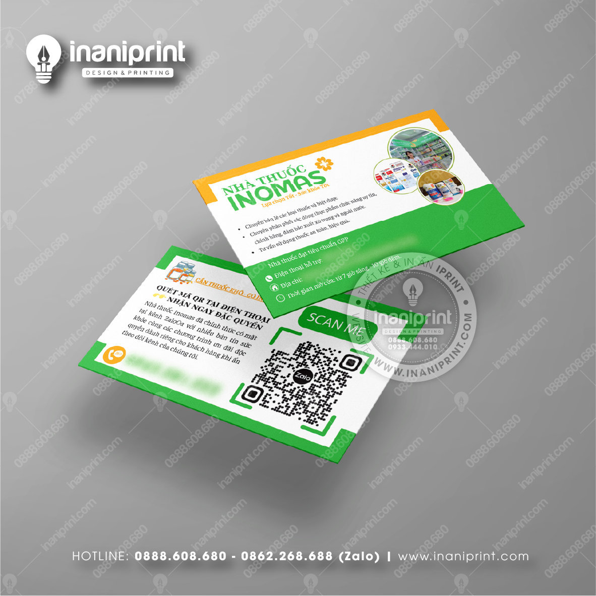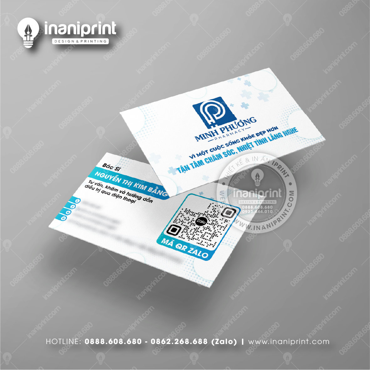 In Name Card Nhà Thuốc là quá trình thiết kế và in ra những tấm Danh Thiếp Tiệm Thuốc (Card Visit) có chứa thông tin quan trọng: tên, chức vụ, công ty, số điện thoại, email, website, logo. Chúng được in trên giấy, nhựa hoặc PVC, bên cạnh đó là được áp dụng in offset hay kỹ thuật số, cùng các gia công tăng tính thẩm mỹ và độ bền (cán màng, ép kim).